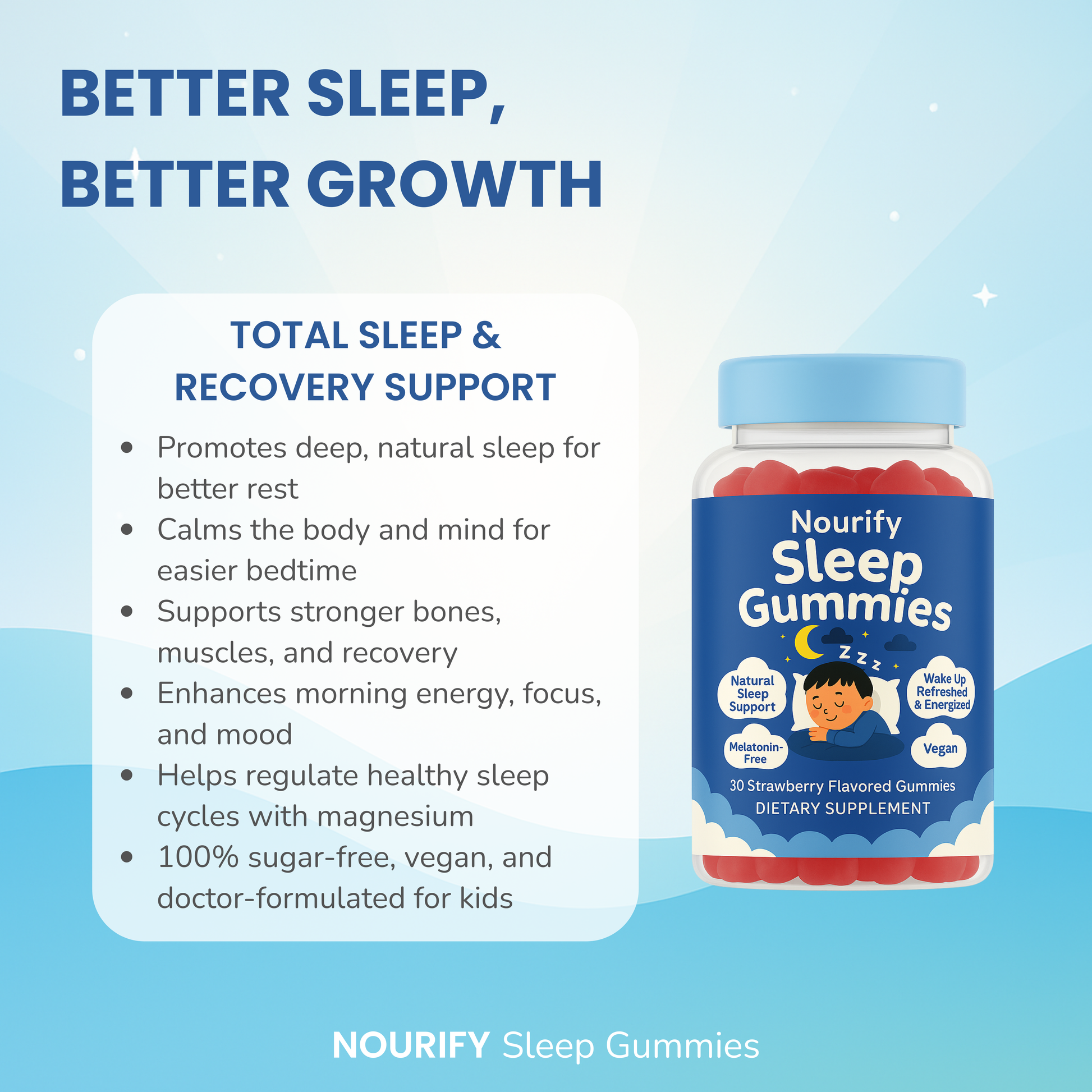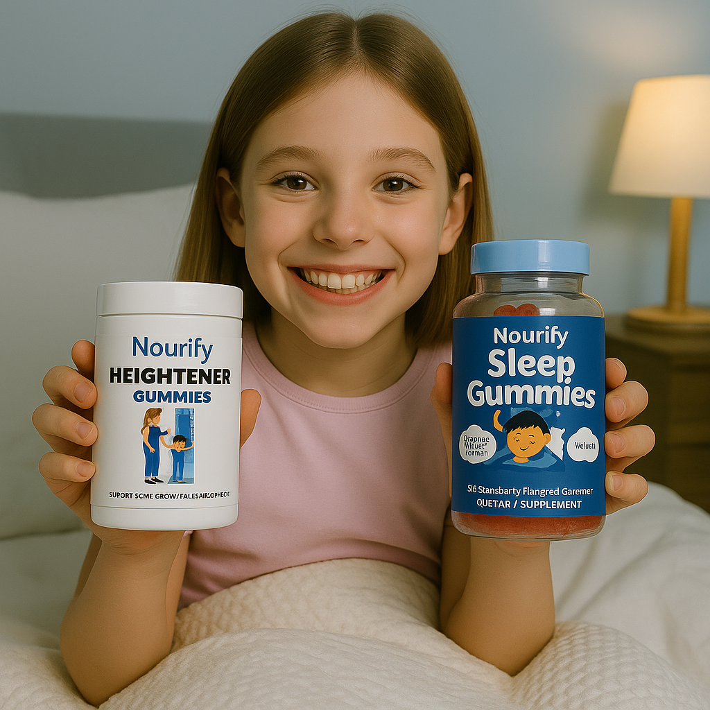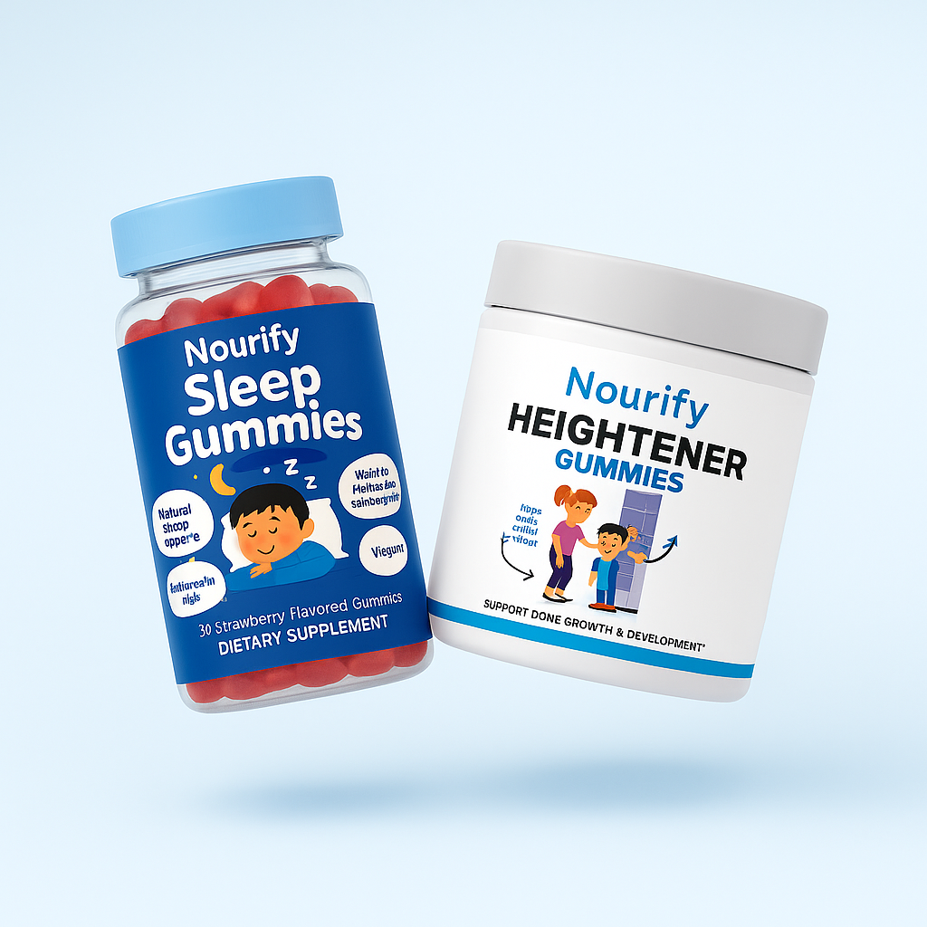 The Nourify Duo Bundle combines Heightener Gummies and Sleep Gummies to give kids and teens complete day-and-night support for healthier growth, stronger bones, confident posture, and deep, restorative sleep. Formulated with pediatric insight, this powerful pair delivers essential vitamins, minerals, and calming magnesium — helping kids grow taller, recover better, and wake up energized.